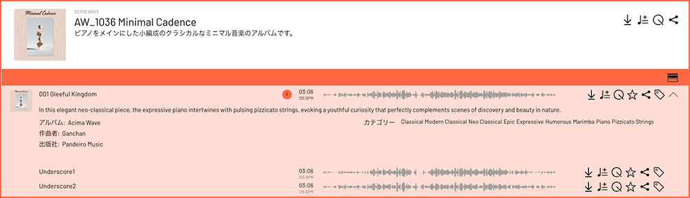 また、トラック情報のアイコンをクリックするとアルバム全曲のキューシート用メタデータ(CSV)がダウンロードされます。