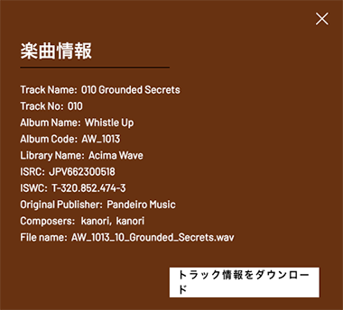 このウインドウで「トラック情報をダウンロード」をクリックするとこの楽曲のキューシート用メタデータ(CSV)がダウンロードされます。ダウンロードされたメタデータは日本語表記です。