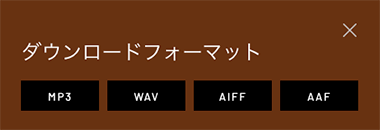 ダウンロードするファイル形式はアイコンクリック後に表示されるウインドウで選択できます。(WAVEとAIFFは24bit 48kHz、MP3は320kbps 44.1kHzです。)